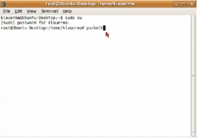 Give the terminal window root privilege by typing the command "sudo su" at the command prompt. You will be required to provide a root password. Once you have root privilege, type "packeth" at the command prompt and hit enter (Figure 92).