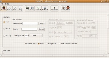 This is a partial view of the default window that appears for packETH upon launching. You will notice that this packet generator supports ver II, 802.3 and 802.1q frames. (See Figure 93.)